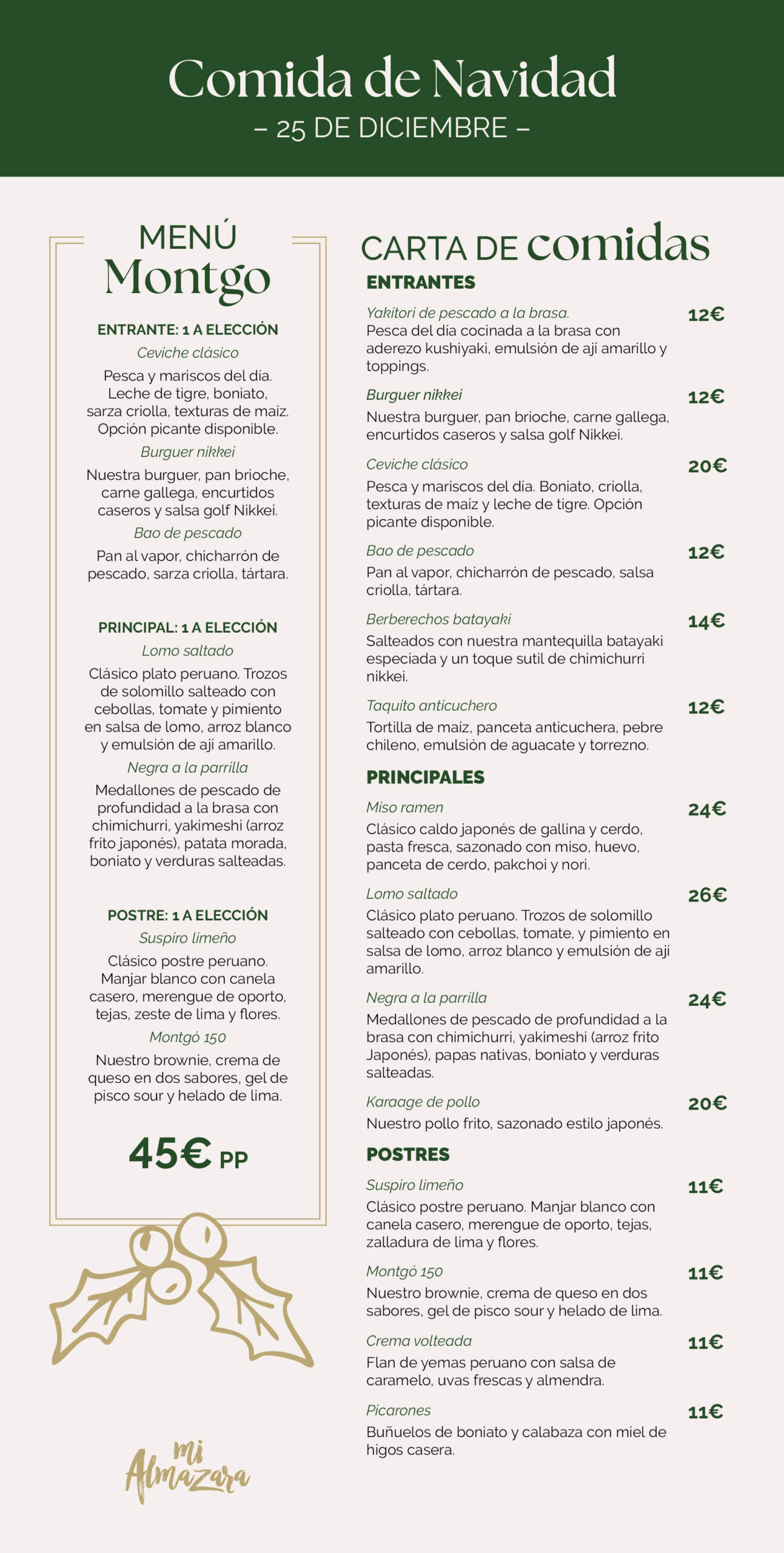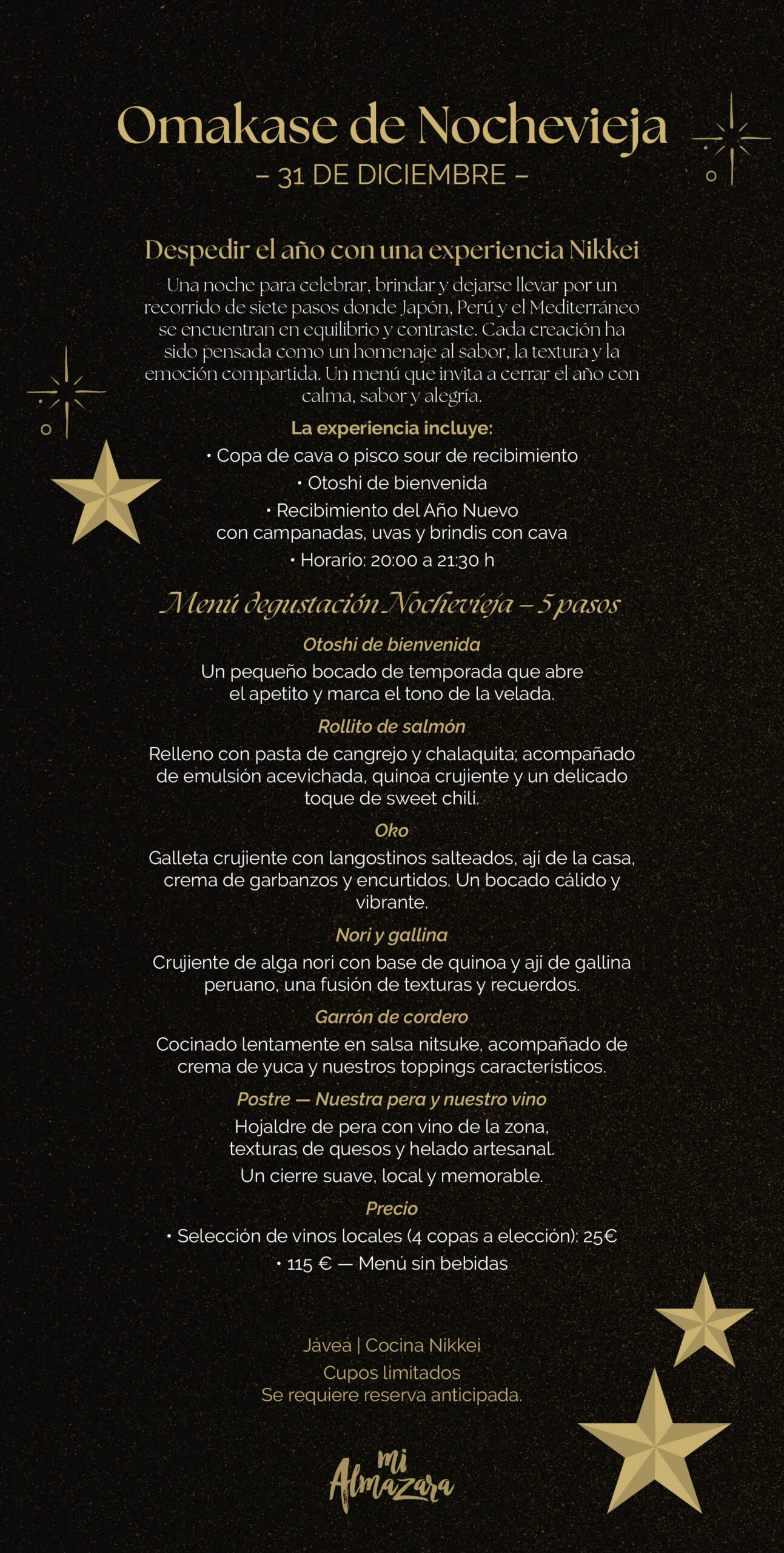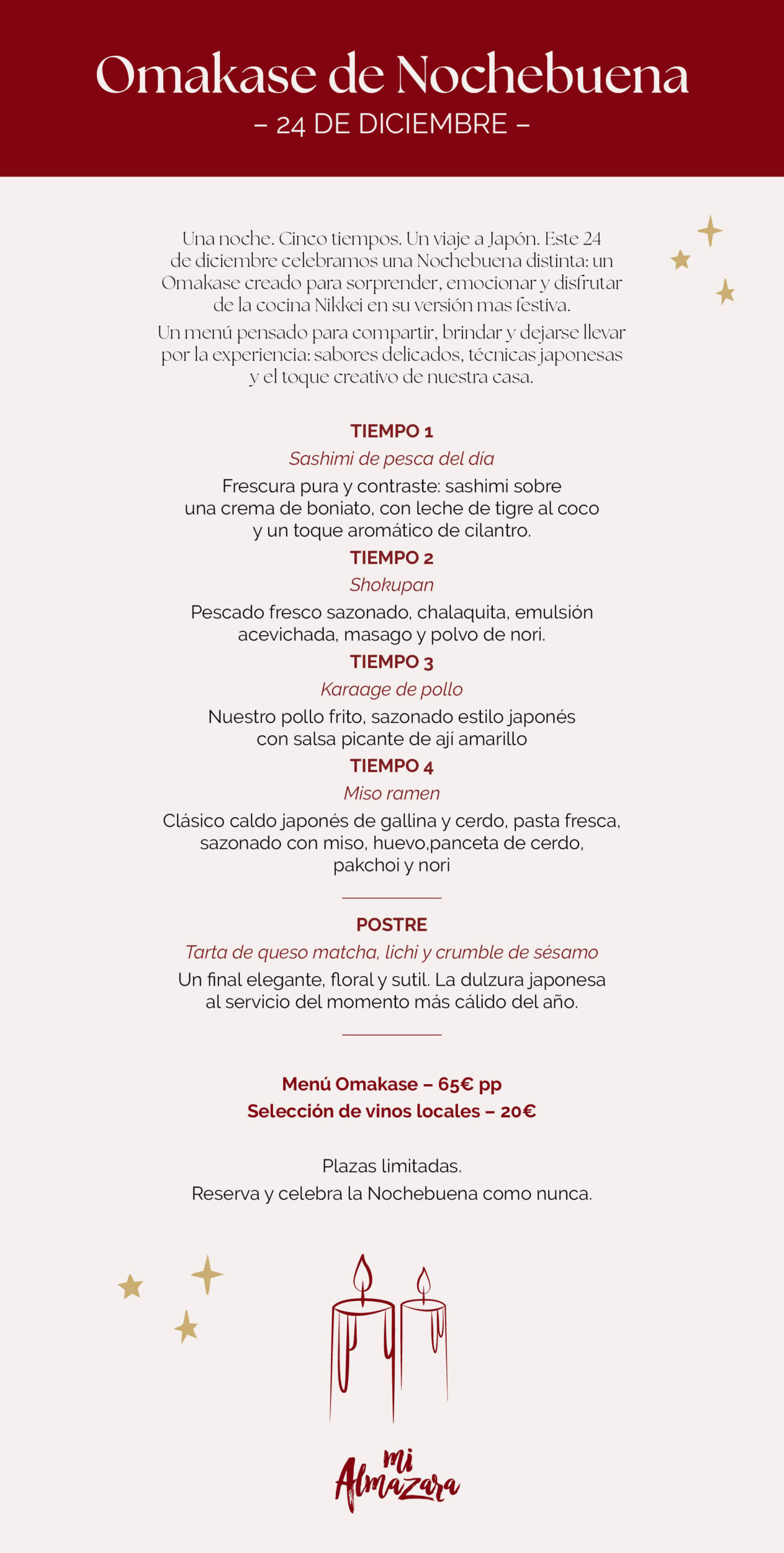 Te invitamos a redescubrir la cocina Nikkei a través de una experiencia gastronómica única con sabor peruano, técnica japonesa y producto local. Ven a celebrar la Navidad con los tuyos en Mi AlmaZara.